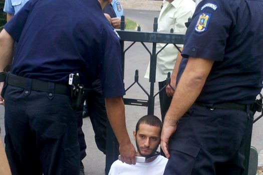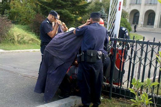Purtătorul de cuvânt al organziaţiei „Regeneration”, Raluca Dan, a declarat pentru MEDIAFAX că trei dintre cei patru oameni care erau legaţi cu laţuri au fost scoşi de jandarmi şi legitimaţi, iar unul protestează în continuare legat cu lanţuri.