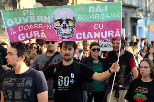 Ei au purtat pancarte pe care scrie „Mandatul trece, cianura rămâne”, „Stop fascismului corporatist”.