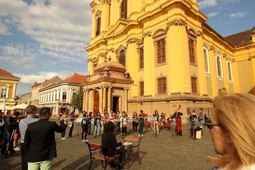 Aproximativ 30 de muzicieni au cântat „Oda bucuriei”, duminică după-amiază, în centrul Timişoarei, în cadrul unui flashmob care a precedat protestul faţă de proiectul de la Roşia Montană, la care participă circa o sută de persoane.