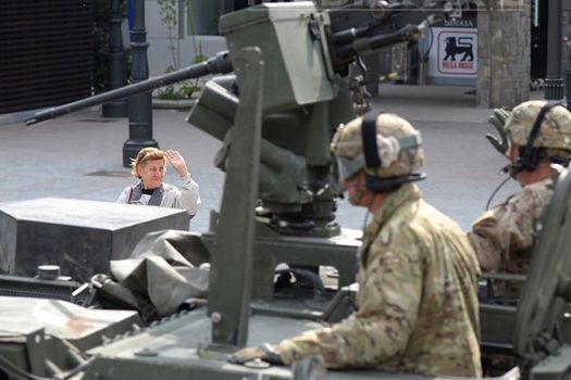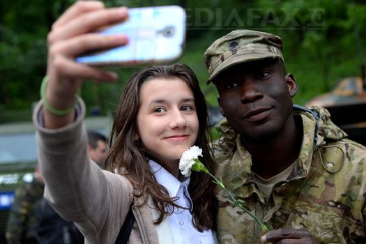 ”E mai fain decât în filme. Am vrut să văd cum arată un soldat american pe bune pentru că până acum i-am văzut doar la televizor“, a spus un băieţel de nouă ani, care coborâse de pe un blindat unde îl suise bunicul lui pentru a-i face o poză.