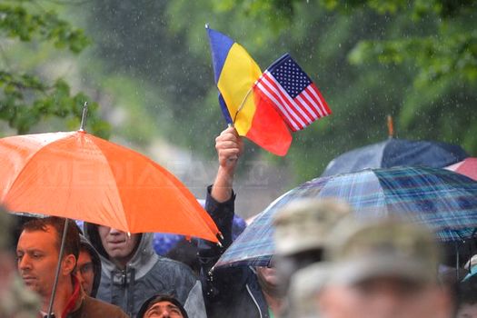 După câteva ore de aşteptare şi câteva reprize de ploaie, în jurul orei 15.00, au început să îşi facă apariţia transportatoarele militare, fiecare având câte un steguleţ românesc şi unul american.