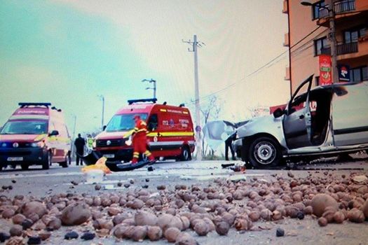 Maşina tânărului era plină cu bidoane de ţuica şi cu nuci, care s-au împrăştiat peste tot pe stradă.