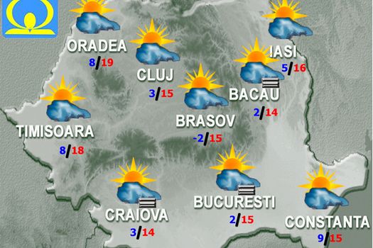 Vântul va sufla slab şi moderat, cu unele intensificări în Moldova, Banat, Crişana, pe litoral şi la munte. Temperaturile maxime, în general în creştere uşoară faţă de intervalul precedent, se vor situa între 12 şi 19 grade, uşor mai scăzute în zonele cu ceaţă persistentă, iar cele minime se vor încadra între -5 grade în depresiunile Carpaţilor Orientali şi 12 grade în Dealurile de Vest.