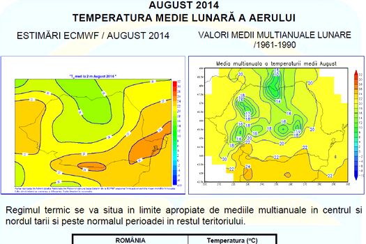 Regimul termic se va situa în limite apropiate de mediile multianuale în centrul şi nordul ţării şi peste normalul perioadei în restul teritoriului.