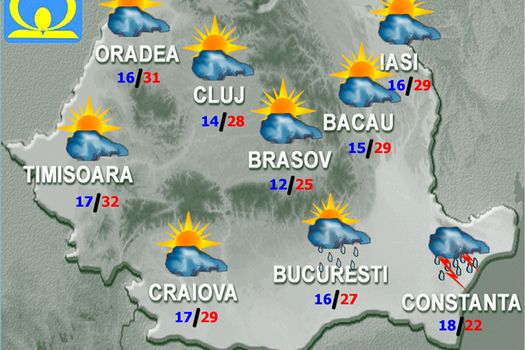 Excepţie va face sud-estul ţării, unde vor fi înnorări accentuate şi, cu precădere pe parcursul zilei, va continua să plouă pe arii extinse. În Dobrogea cantităţile de apă vor depăşi 25 l/mp, local se vor cumula 40…50 l/mp, iar vântul va avea intensificări cu viteze de 55…60 km/h. Vor mai fi condiţii de grindină. În restul teritoriului doar izolat, după-amiaza, vor fi posibile ploi de scurtă durată, cu precădere la munte. Temperaturile maxime se vor încadra între 20…22 de grade pe litoral şi 32 de grade în Câmpia de Vest; minimele termice vor fi cuprinse între 11 şi 21 de grade, uşor mai scăzute în depresiuni.