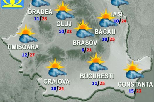 Temperaturile maxime vor fi cuprinse între 15 şi 25 de grade, mai ridicate în sud şi în sud-est, până la 29…30 de grade în Lunca Dunării; minimele termice se vor încadra între 7 şi 15 grade.