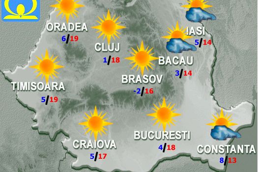 Dimineaţa, dar mai ales în cursul nopţii, în zonele joase pe arii restrânse va fi ceaţă. Vântul va sufla slab până la moderat, cu unele intensificări în sudul Banatului. Temperaturile maxime se vor încadra între 12 grade pe litoral şi în deltă şi 20…21 de grade în regiunile vestice, iar cele minime între -1 şi 10 grade, mai scăzute în estul Transilvaniei până la -5 grade. Izolat se va produce brumă în Podişul Transilvaniei şi în subcarpaţi.