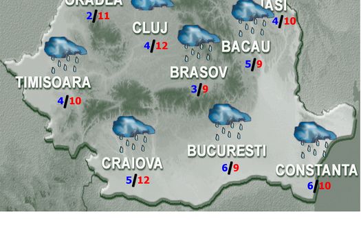 Va ploua în sudul şi estul ţării, local în centru şi nord-vest şi izolat în rest. La munte, iar noaptea şi în estul Transilvaniei şi Subcarpaţii Moldovei, vor fi precipitaţii mixte. În regiunile extracarpatice, precum şi în masivele montane din sud şi est, cantităţile de apă vor depăşi pe arii restrânse 15…20 l/mp şi izolat 25…30 l/mp. Vântul va prezenta intensificări în zona de munte şi în regiunile estice şi sud-estice, unde vor fi rafale de 60 – 70 km/h, iar temporar şi în vestul teritoriului, cu 50-55 km/h. Temperaturile maxime se vor încadra între 6 grade în depresiuni şi 13 grade în nord-vest, iar cele minime vor fi cuprinse, în general, între 0 şi 7 grade.