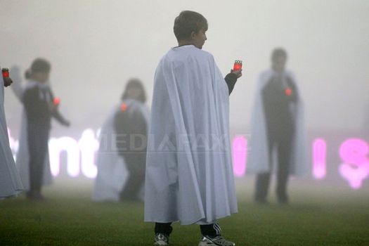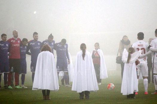 Înainte de startul jocului, la mijlocul terenului s-au strâns mai mulţi copii şi tineri cu pelerine albe şi care ţineau câte o lumânare în mână. La marginea terenului, în spatele unei porţi, s-a format o cruce din lumânări.