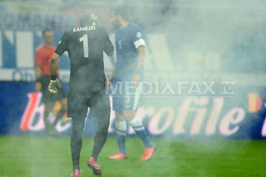 În minutul 42, crainicul stadionului a făcut apel la fanii români să nu mai ţintească cu lasere jucătorii eleni.