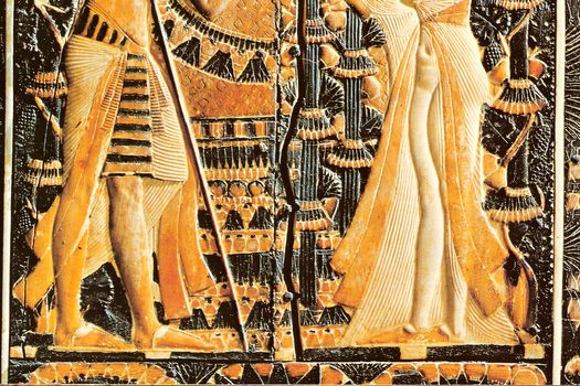 Într-un alt relief (Sursa Foto – Wikipedia Commons), Tut, gârbovit şi mânuind un baston, primeşte flori de la soţia şi sora sa.