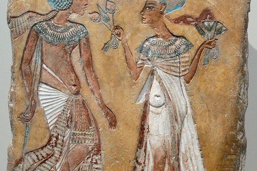 Un relief de la Muzeul Egiptean din Berlin. Sursa Foto: Andreas Praefcke. Deşi părea să fie un cuplu regal despre care se bănuia iniţial că erau Akenaten şi Nefertiti sau Smenkhkare and Meritaten, bastonul şi poziţia gârbovită a personajului masculin dă indicii că ar fi vorba despre un alt cuplu – Tutankamon şi Ankesenamon.