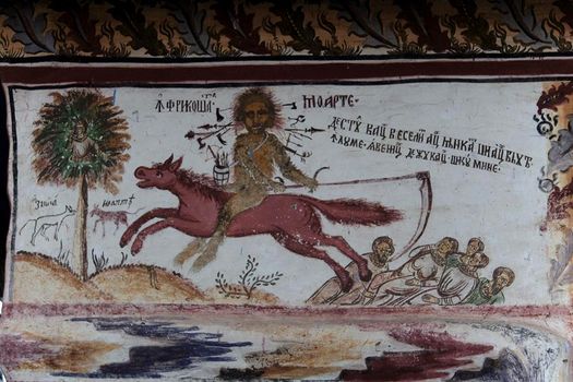 C.B.:În iconografie, Moartea apare figurată ca un personaj umanoid înzestrat cu diverse unelte. În reprezentările populare de la monumentele de cult din Ţara Românească, împodobite în perioada 1780-1850, cel mai frecvent o întâlnim purtând coasa, ce poate fi însoţită şi de alte instrumente ale despărţirii sufletului de trup (săgeţi, arc, seceră, suliţă, ciocan, cleşte ş.a.), ţinute câteodată într-o desagă.
