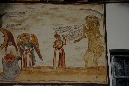 C.B.: În studiile thanatologice întâlnim o teorie (astăzi destul de contestată) care afirmă că sexul Morţii este în strânsă legătură cu genul substantivului prin care o denumim într-o anumită limbă. Înfăţişarea feminină a substantivului „moarte” din limba română pare a fi probată de imaginile din pictura noastră religioasă, în care personajul este înzestrat cu trăsături distinctiv feminine (coapse, sâni, plete, buze pline şi roşii). Există însă şi o suită de reprezentări pe care le-am putea include în genul masculin sau chiar într-unul neutru, asexuat (mai ales atunci când apare în ipostază de schelet). Mai interesante însă mi se par situaţiile în care Moartea este drapată intenţionat în veşmintele genului feminin, pentru a putea alcătui un cuplu straniu cu individul cu care dialoghează – un tânăr prinţ – ca în frescele exterioare de la edificiile argeşene din Schitu Matei şi Cotu-Uda, în timp ce alături de „cocoana împărăteasă” de la biserica din Glâmbocu îşi menţine o identitate neutră, cu tente masculine.