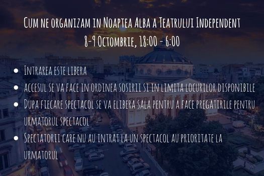 Intrarea este liberă la toate evenimentele din cadrul Nopţii Albe a Teatrului Independent, în limita locurilor disponibile.