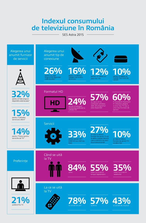 Studiul „Indexul consumului de televiziune în România” a fost realizat de Mercury Research pentru SES Astra România în luna iunie 2015, pe un eşantion reprezentativ la nivel naţional de 400 de persoane (66% din mediul urban şi 33% din rural), cu vârste de peste 18 ani, utilizatori de servicii de televiziune. Marja de eroare a studiului este +/- 5%.
