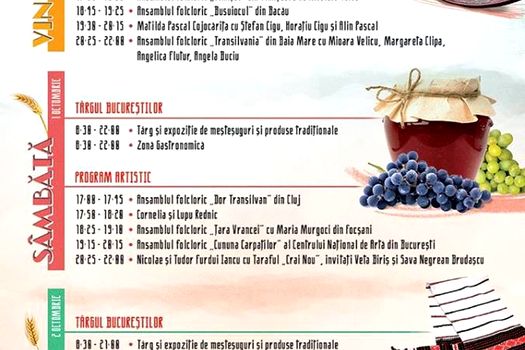 Agenda sărbătorii cuprinde un târg de meşteşugari, producători din toată ţara, două zone dedicate gastronomiei autohtone şi un bogat program artistic cu nume celebre ale folclorului românesc!