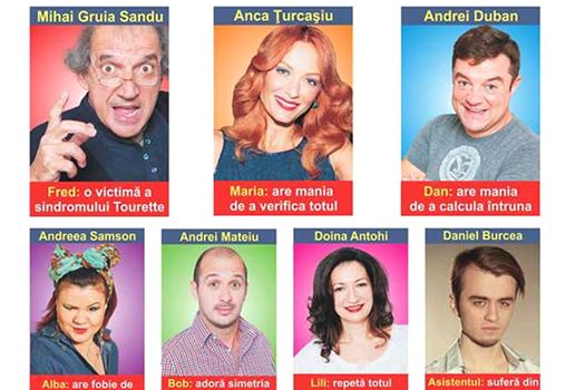 Publicul va râde în hohote alături de Alba – o maniacă a curăţeniei, care mai e şi laborantă pe deasupra (Monica Ciuta), Dan – un taximetrist obsedat de calcule (Andrei Duban), Bob – un tânăr programator care se deplasează sărind de pe o piesă de mobilier pe altă (Victor Bucur), Maria – o habotnică ce are şi mania verificărilor (Anca Ţurcaşiu), Lili – o tânără care repetă fiecare frază de două ori (Doina Antohi) şi Fred – un individ care are ieşiri verbale şi gesturi bruşte (Mihai Gruia Sandu!). Şi pe lângă cei şase pacienţi, bine intenţionat, însă mereu depăşit de situaţie, apare în momentele de maximă tensiune un asistent în ton cu ultimele tendinţe ale modei (Daniel Burcea).