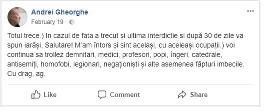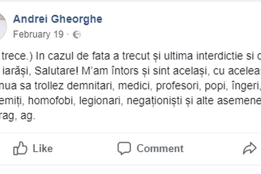 Vedeţi mai jos ultima postare de pe Facebook a jurnalistului, imediat după ce i s-a reactivat contul ce a fost blocat.