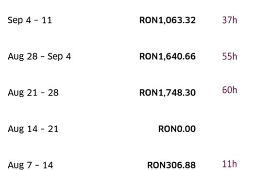 Ciubotaru a câştigat cel mai puţin în săptămâna august (7-14) obânând 306 lei pentru 11 ore de muncă, iar cel mai mult în săptămâna 21-28 august, anume 1748 de lei pentru 60 de ore de muncă. Sumele afişate reprezintă încasările după ce Uber şi-a luat partea de 25%.