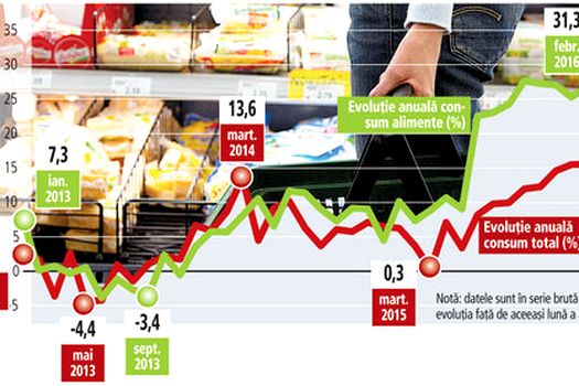 Anul trecut vânzările de alimente au fost cele care au susţinut creşterea totală a consumului de aproape 9%, mai ales după 1 iunie, când a avut loc reducerea TVA la mâncare şi băuturi nonalcoolice de la 24% la 9%. În lunile de după creşterea vânzărilor de alimente ajungea şi la 30%, potrivit datelor INS. Începând cu iulie 2016, când efectul de bază al reducerii TVA s-a dus, consumul de alimente s-a temperat. Astfel, el a ajuns în august să aibă cel mai mic avans de după decembrie 2014.