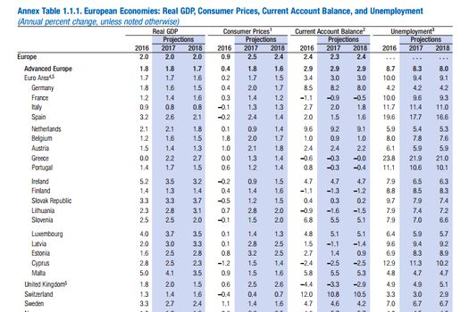 La nivelul întregii Europe, creşterea economică prognozată este de 2,0% atât pentru 2017, cât şi pentru 2018, în timp ce pentru zona euro cifrele sunt de 1,7% în 2017 şi 1,6% în 2018.