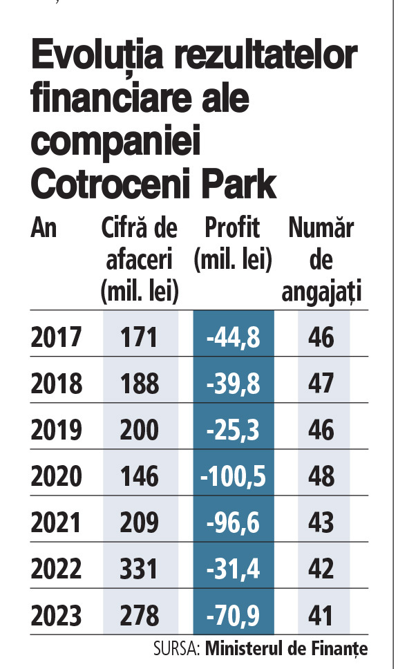 Compania a continuat să raporteze pierderi, acestea adâncindu-se până la aproape 71 de milioane de lei, de la 31 de milioane de lei în anul anterior. Ca număr de angajaţi, Cotroceni Park a rămas constant, la circa 40 de oameni.
