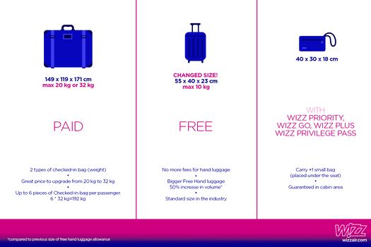 Compania aeriană mai lansează un nou serviciu pentru pasageri numit WIZZ Priority care include prioritate la îmbarcare, pasagerii putând lua cu ei la bord încă un bagaj mic de mână (cu dimensiuni maxime de 40x30x18 cm) şi o garanţie, valabilă din 29 octombrie, potrivit căreia bagajul mare de mână se poate lua la bordul aeronavelor (garanţia este, de asemenea, valabilă şi pentru pasagerii care şi-au achiziţionat Wizz Go, Wizz Plus şi Wizz Privilege Pass).