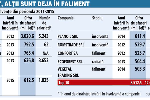 Aceste companii au avut afaceri cumulate de 8,5 miliarde de lei, respectiv 10% din tot businessul în insolvenţă, şi 12.600 de salariaţi în anul de dinaintea intrării în incapacitate de plată.