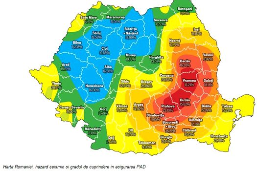 „Dacă analizăm harta riscurilor seismice, observăm că gradul de cuprindere în asigurare a locuinţelor pe poliţe de asigurare obligatorie PAD se situează sub 20% (cu excepţia Bucuresti+Ilfov: 36,81% şi Prahova: 22,1%), ceea ce este cel puţin îngrijorător. De asemenea, observăm că doar în 7 judeţe (Bucuresti+Ilfov, Timiş, Sibiu, Braşov, Prahova, Covasna, Constanţa) gradul de penetrare al asigurării PAD depăşeşte 20%, iar în 5 judeţe acesta este se situează la polul opus, cu un grad de penetrare mai mic de 10% (Gorj, Mehedinţi, Teleorman, Vaslui, Botoşani)”, au mai arătat autorii studiului.