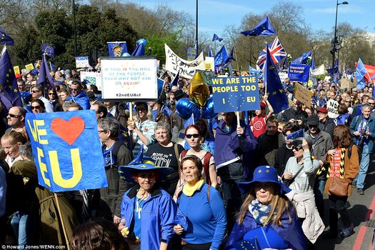 Participanţii la marşul „Uniţi pentru Europa” au fluturat steaguri UE, au purtat pancarte anti-Brexit şi au ţinut un moment de reculegere în memoria victimelor atacului terorist de la Londra, relatează The Associated Press.