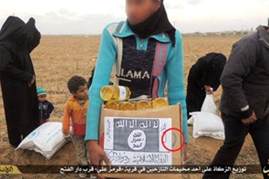 Cutiile au fost inscripţionate ulterior cu sigla organizaţiei teroriste sunnite, dar încă sunt vizibile însemnele Programului Alimentar Mondial (PAM).