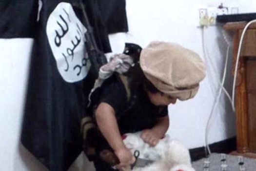 Succesiv, copilul ridică triumfător cuţitul în aer când bărbatul din spatele camerei pronunţă cuvântul takfir (n.r. cuvânt peiorativ prin care ISIS descrie persoanele care aparţin altor religii).