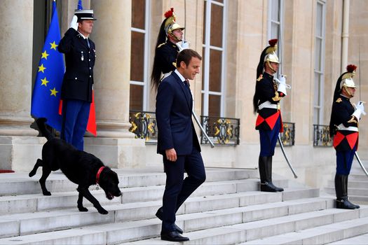 Macron a fost flancat de câinele său, Nemo, în momentul în care l-a întâmpinat luni pe preşedintele Nigerului, Mahamadou Issoufouat, la Elysee.