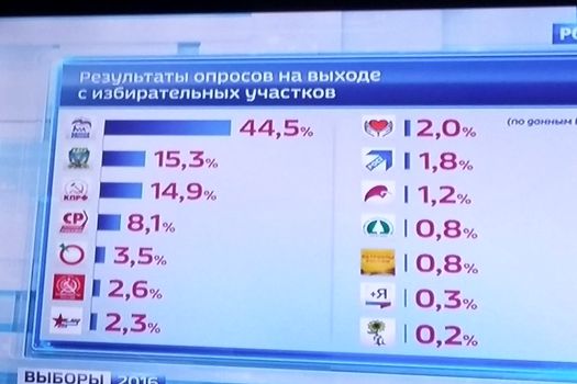 Partidul Rusia Unită (conservator, centru-dreapta), condus de premierul Dmitri Medvedev, a obţinut 44,5% din cele 450 de locuri din Duma de Stat, Camera inferioară a Parlamentului rus, potrivit sondajului efectuat de Centrul pentru studierea opiniei publice (VCIOM) şi difuzat de agenţia Tass.