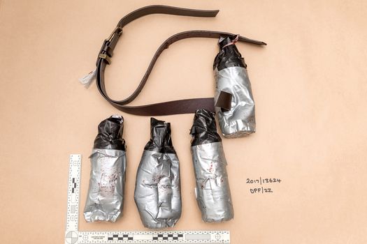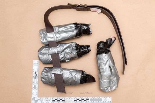 Toţi cei trei atacatori purtau aceste curele din piele, pe care erau ataşate câte trei sticle de apă din plastic acoperite cu bandă adezivă neagră şi gri. Centurile explozive false se aflau în posesia bărbăţilor atunci când au fost împuşcaţi mortal de către forţele de securitate britanice.
