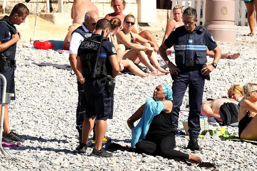 Imagini cu poliţia confruntând o femeie care nu se supunea legii, făcute în Nisa, înfăţişează patru poliţişti stând în jurul unei femei care se odihnea pe ţărm, în Promenade des Anglais, ultima scenă a atentatului de luna trecută, când un camion a intrat în mulţime de Ziua Naţională a Franţei.