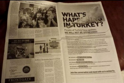 În spaţiul publicitar cumpărat în New York Times, protestatarii au prezentat o imagine cu un cartuş de gaze lacrimogene deasupra următorului mesaj: „CE SE ÎNTÂMPLĂ ÎN TURCIA?”