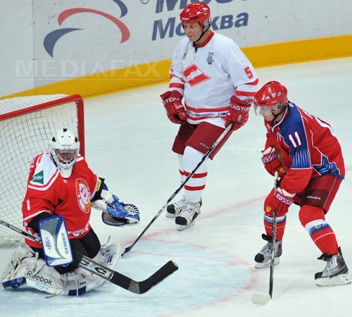 Îmbrăcat într-o uniformă roşu cu albastru inscripţionată cu numărul 11 şi purtând însemnele Rusiei, Putin a trimis pucul în palsă în mai multe rânduri în cursul acestui antrenament, la care au aprticipat, între alţii, septuplul campion al fostei Uniuni Sovietice Viaceslav Bikov şi preşedintele clubului de hochei CSKA Viaceslav Fetisov, într-un complex sportiv din Moscova, potrivit agenţiilor ruse.