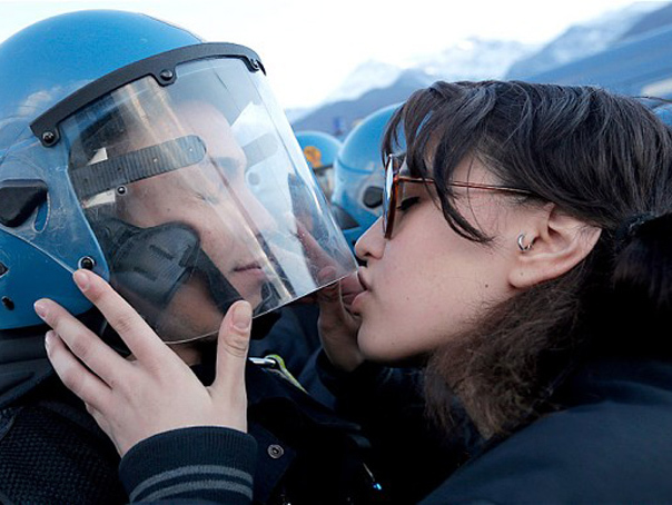 Studenta în vârstă de 20 de ani, Nina de Chiffre, a fost fotografiată în timp ce săruta casca agentului de poliţie Salvatore Piccione, în cursul unui protest faţă de construirea liniei feroviare Torino-Lyon.