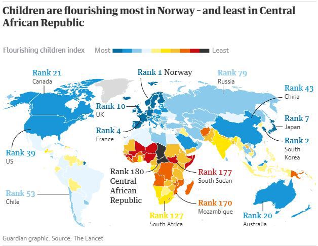 Norvegia, Coreea de Sud, Olanda, Franţa şi Irlanda sunt ţările cele mai bune pentru copii. La polul opus găsim Republica Central Africană , Ciad, Somalia, Nigeria şi Mali.