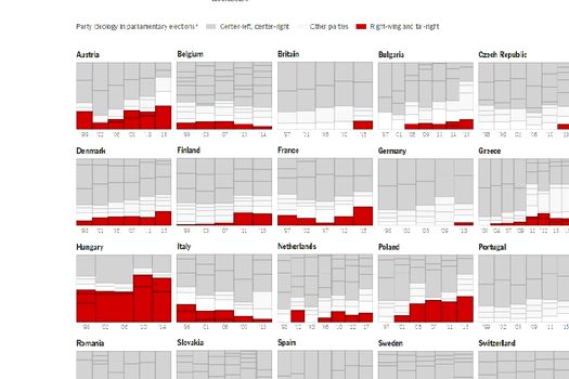„În contextul crizei imigraţiei, al inegalităţilor economice, creşterii dezamăgirii faţă de Uniunea Europeană şi sentimentului pierderii identităţilor naţionale, partide de extremă-dreapta au înregistrat progrese electorale într-un număr din ce în ce mai mare de ţări europene. Partidele de extremă-dreapta prezentate în graficul de mai jos au un spectru politic larg, de la cele cu doctrine populiste, la cele naţionaliste şi neofasciste”, scrie cotidianul The New York Times într-un articol intitulat „Cât de mult înclină Europa spre doctrine politice de dreapta?”.
