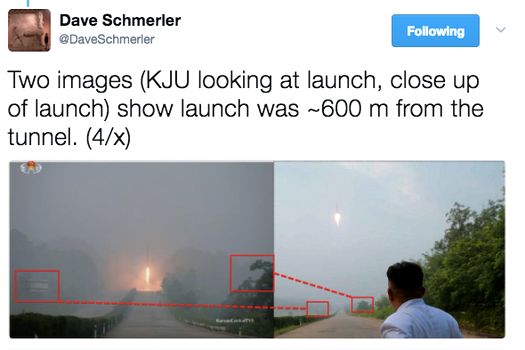 Schmerler şi-a confirmat teoria cu ajutorul celui de-al doilea detaliu observat în fotografii. O a doua poză evidenţia mai multe garduri vii plantate de-a lungul autostrăzii. Pornind de la aceste două surse, el a identificat o parte a unui frunziş care a apărut într-un videoclip separat al testării celor trei rachete balistice cu rază medie de acţiune, ceea ce i-a permis să estimeze distanţa lui Kim Jong-un.