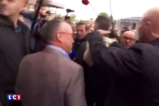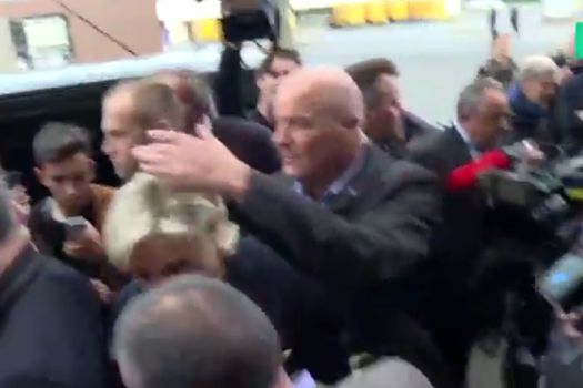 „Afară cu fasciştii!” şi „Nu aveţi ce căuta aici, doamnă!”, au strigat manifestanţii, aruncând cu ouă spre candidatul formaţiunii de extremă-dreapta Frontul Naţional.
