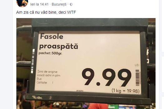 Plecat la cumpărături într-unul din magazinele Kaufland din Bucureşti, un utilizator de Facebook s-a oprit în faţa standului în care se vindea fasole ambalată în pungi de 500 de grame şi a făcut o poză etichetei produsului pe care, apoi, a postat-o pe profilul său.