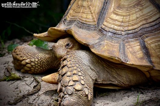 Leonardo, broasca ţestoasă africană pintenată, a fost salvată de fundaţia WFFT (Wildlife Friends Foundation Thailand) dintr-o grădină zoologică din Bangkok în 2013.