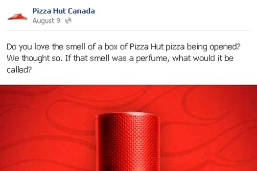 Pentru că a primit foarte multe răspunsuri, Pizza Hut a decis lansarea unui parfum care are miros de pizza şi poartă numele de „Eau de Pizza Hut”, scrie tabloidul britanic Daily Mail. Parfumul a fost lansat în ediţie limitată cu prilejul atingerii cotei de 100.000 de fani pentru pagina de Facebook a Pizza Hut Canada.