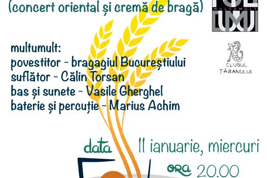 Miercuri, 11 ianuarie 2017, începând cu ora 20:00, la Clubul Ţăranului din cadrul MŢR va avea loc concertul trupei Multumult, intitulat „Mult mi-e bragă muzichia”. Trupa bucureşteană de free improvisation îşi propune de această dată să depăşească limitele extrem de riguroase ale armoniilor otomane într-un spectacol de sunet şi imagine extrem de sugestiv. Ultimul album al trupei a fost lansat în 2015 şi se intitulează „ZigZag”.