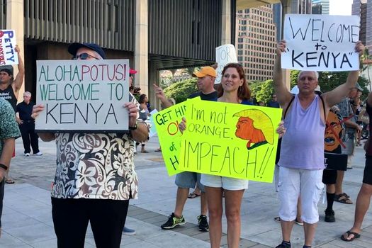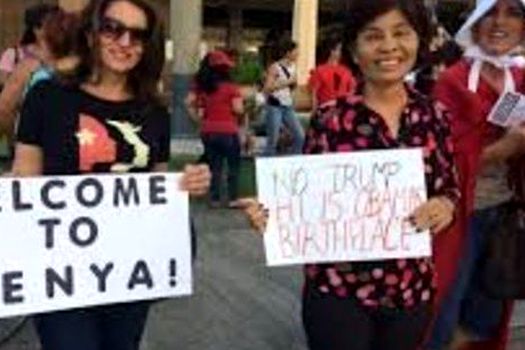 Se pare că oamenii din Hawaii au o memorie foarte bună şi un simţ al umorului dezvoltat. Drept urmare, când Donald Trump şi Melania şi-au început vizita în statul american, cei doi au fost întâmpinaţi cu o serie de pancarte pe care scria ”Bine aţi venit în Kenya”.