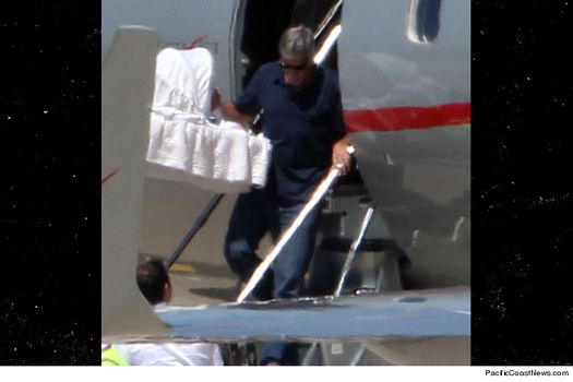 Gemenii în vârstă de o lună ai cuplului George şi Amal Clooney trăiesc deja o viaţă luxoasă, aceştia fiind zăriţi la bordul avionului privat al tatălui lor.
